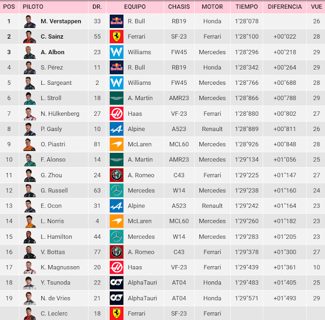 La sesión, por tanto, fue nuevamente dominada por un Max Verstappen que, esta vez sí, pudo tener algo de competencia, con un Carlos Sainz quedando a tan solo 22 milésimas del de Red Bull. Alex Albon nuevamente quedó en tercer puesto, mientras que Logan Sargeant era quinto, lo que podría confirman el buen ritmo de Williams.